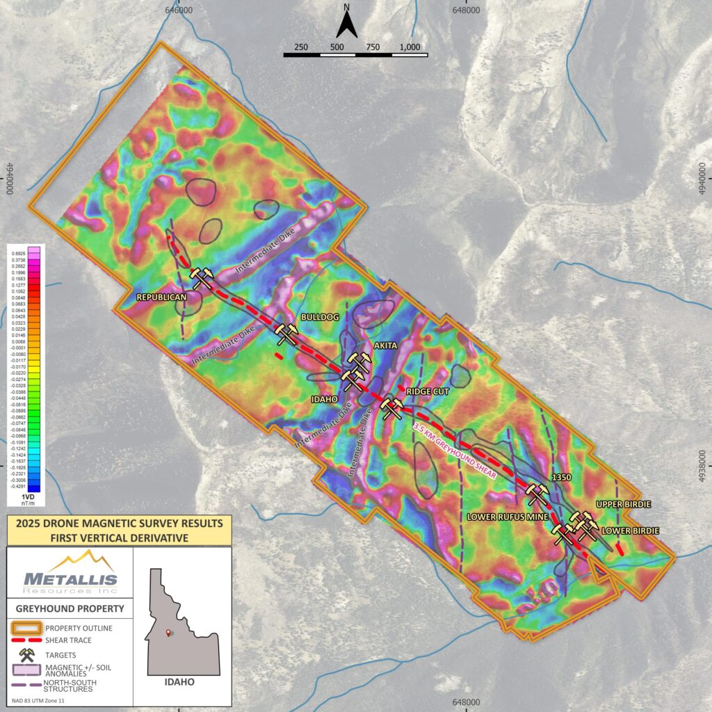 Vancouver, BC – August 14, 2025 – Metallis Resources Inc. (TSX-V: MTS; OTCQB: MTLFF) Metallis Resources Inc. (the “Company” or “Metallis”) is pleased to announce the completion of a high-resolution drone magnetic survey at its optioned Greyhound Property (the “Property”), located in central Idaho. This marks the first geophysical program ever undertaken at the Property and is a major step forward in preparation for the upcoming drill program.