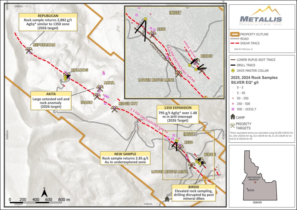 Rock sampling during the 2025 drill program was completed at multiple locations on the Property including the Republican Showing, the northernmost mineralized exposure of the Greyhound shear. A grab sample collected from within the historic Republican pit, an area not previously sampled by the Company, returned 2,882 g/t AgEq*, including 5.9 g/t Au, 1,555 g/t Ag, 7.0% Zn, 18.5% Pb, and 1.9% Sb, from a 10-centimetre galena-rich interval within a 50-centimetre quartz-sulphide vein. These results are comparable in style and grade to mineralization at the 1350 Zone and support continuity of the system over its entire 3.5-kilometre strike length.